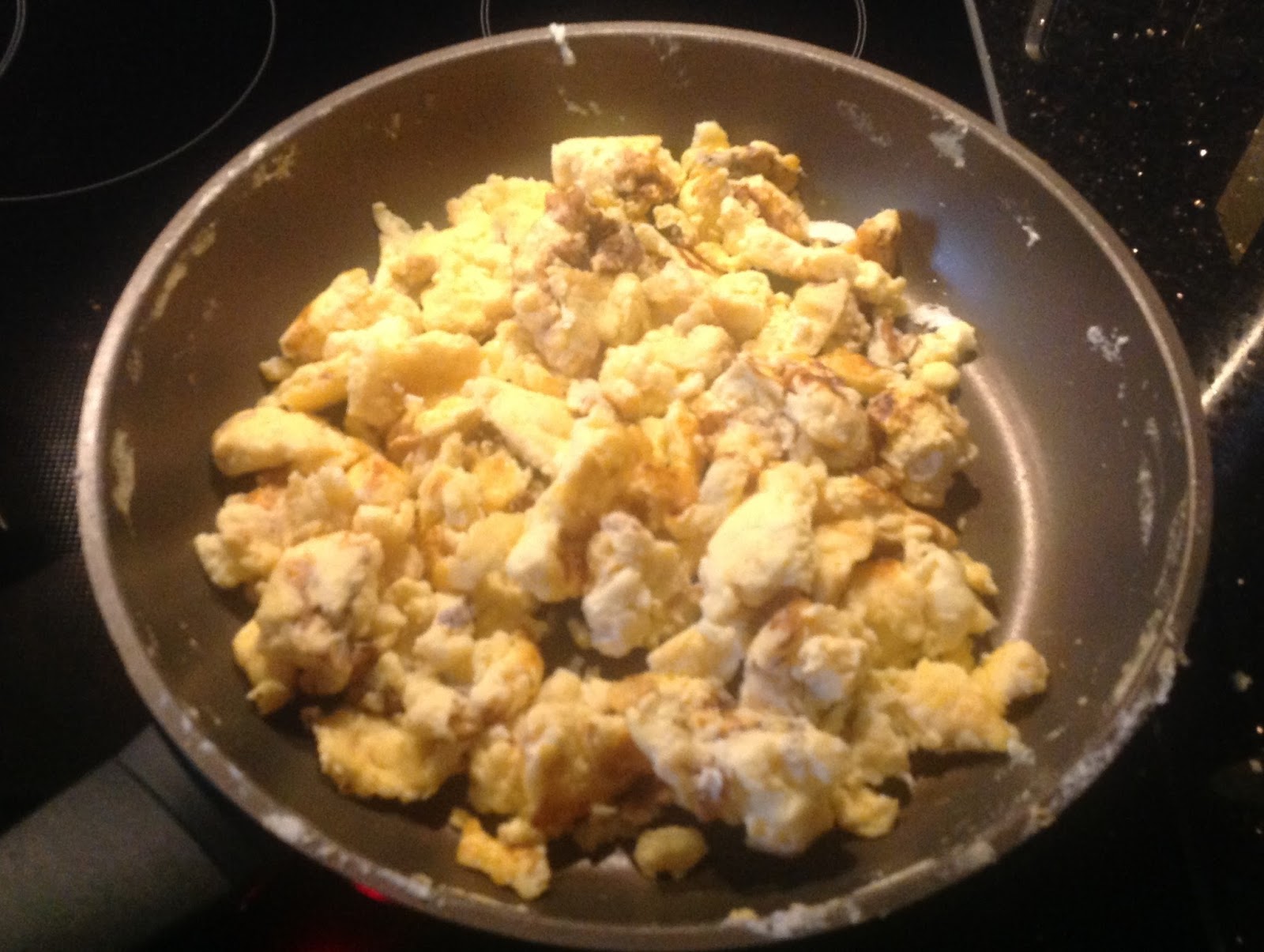 Teig dazu geben und bei mittlerer Hitze backen, den Schmarren dabei in Stücke zupfen.